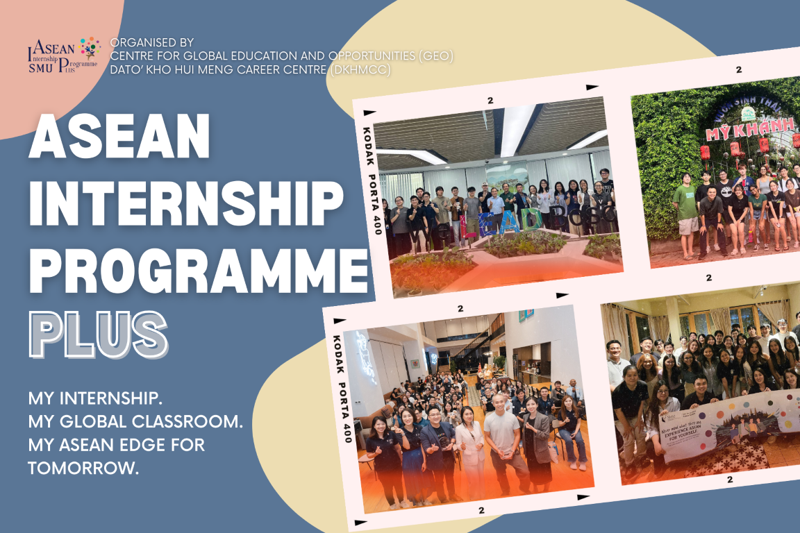 The ASEAN Internship Programme Plus (AIP+) is offered by SMU’s Dato’ Kho Hui Meng Career Centre (DKHMCC) and Centre for Global Education & Opportunities (GEO), designed for SMU students seeking to enhance their employability and global readiness.